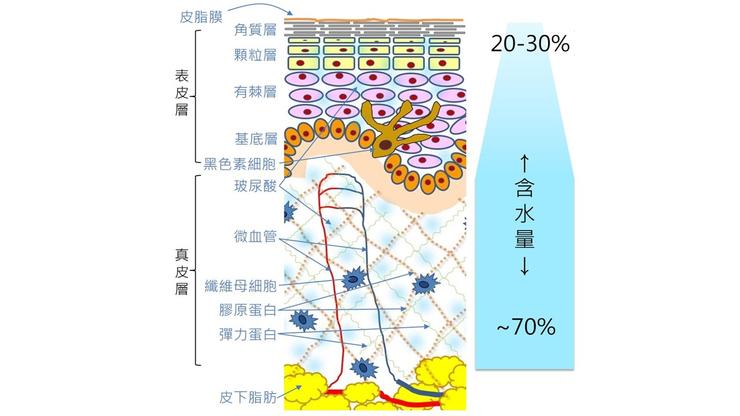 一般來說,健康皮膚中的「水分」由內至外,呈現從多到少的「梯度分布」狀態──在真皮層中約含有 70%的水分,然後逐漸遞減,至最外層角質層時,水分約佔 20~30%。(如圖所示)