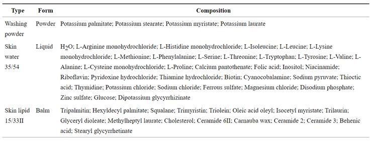 | 3種測試產品:潔顏粉、化妝水、與軟膏所含成分。引用自《Clinical Trial of Low Irritative Skin Care Cosmetics in Japanese Subjects with Dry Skin》Table 1 |
