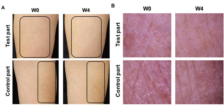 然後分別在第2&第4週時,有醫師評估:受試者的的皮膚狀況變化──發現:測試部位的浸潤、疤痕和乾燥症狀顯著連續緩解。與起始時相比,第2週時,測試部位的紅斑和瘙癢程度有顯著降低,並持續變化改善至第4週觀察時。其中有較嚴重者的丘疹和苔癬化症狀,亦有所緩解。(參下圖)