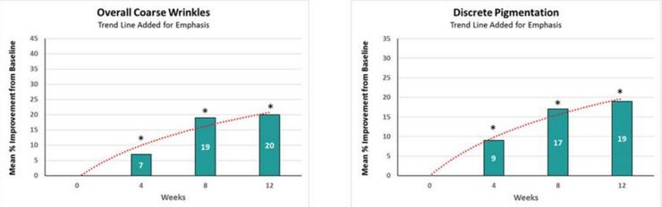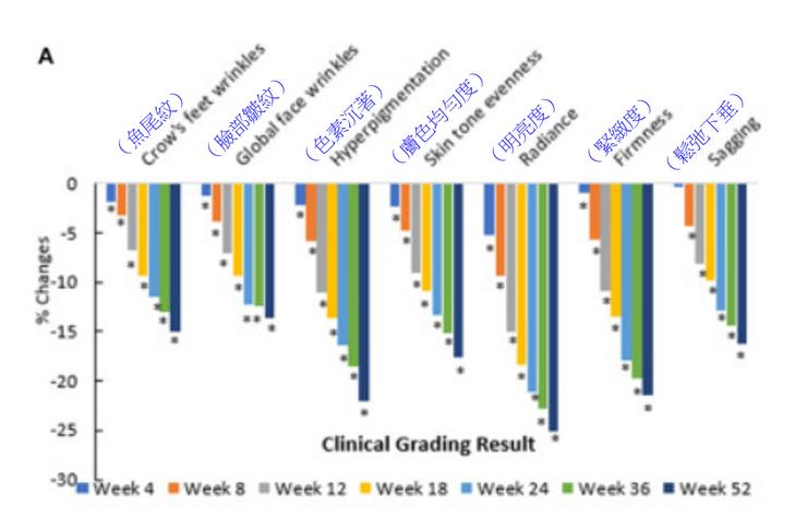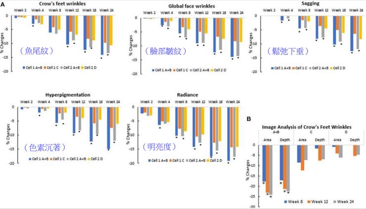根據Lisa DiNatale等人的臨床研究《Novel Rotational Combination Regimen of Skin Topicals Improves Facial Photoaging: Efficacy Demonstrated in Double-Blinded Clinical Trials and Laboratory Validation》報告表示: