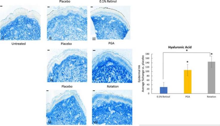 | 旋轉式保養(輪換使用方案)對促進玻尿酸生成,比單獨應用者(0.1%視黃醇 或 PGA)效果更高。(引用自→此文獻 Fig 8.) |